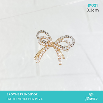 Broche Prendedor Moño Dorado con Perlas y Zirconias (3.3cm) #021