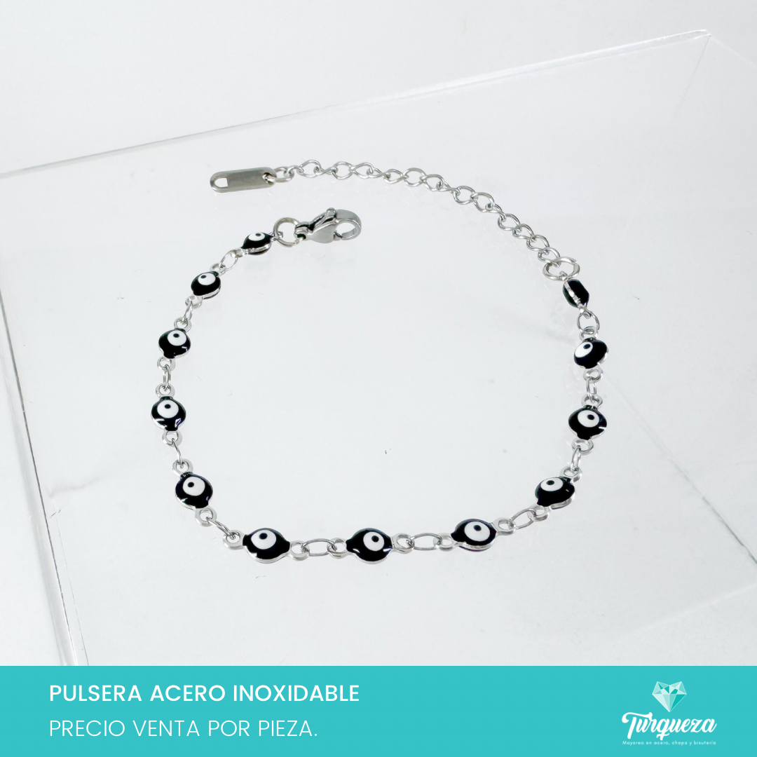 Pulsera Ojo Turco Negro Plateada (18cm-4mm) Acero Inoxidable
