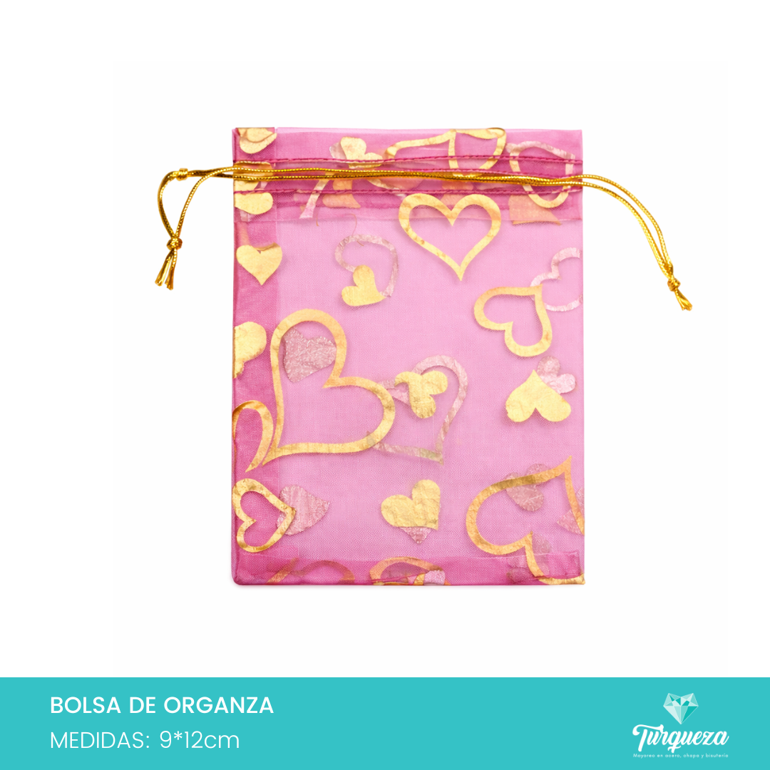 Bolsa de Organza Rosa Fiusha con Corazones Dorados (50pzas 9x12cm)
