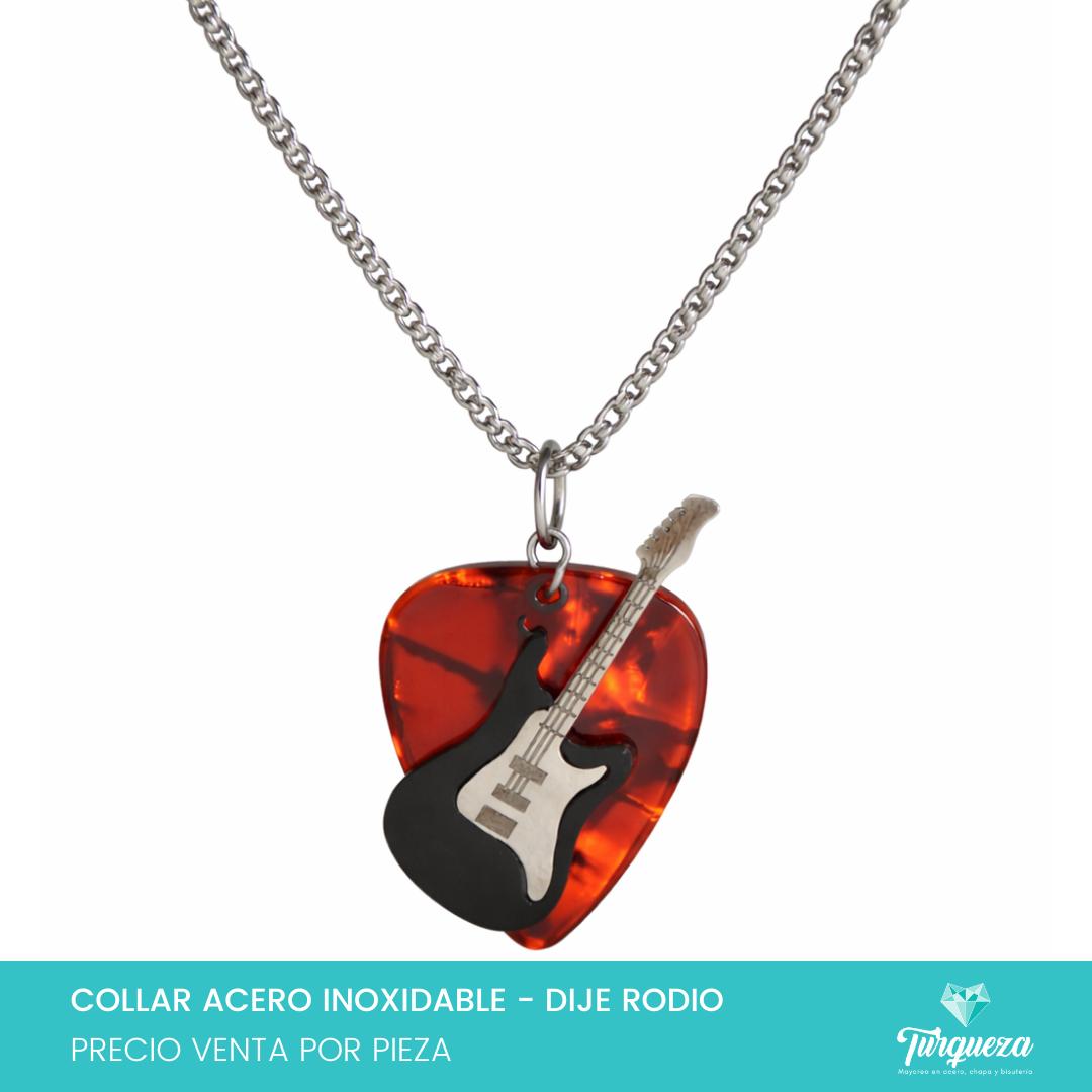Collar Guitarra con Pua Roja Plateado Acero Inoxidable - Dije Rodio