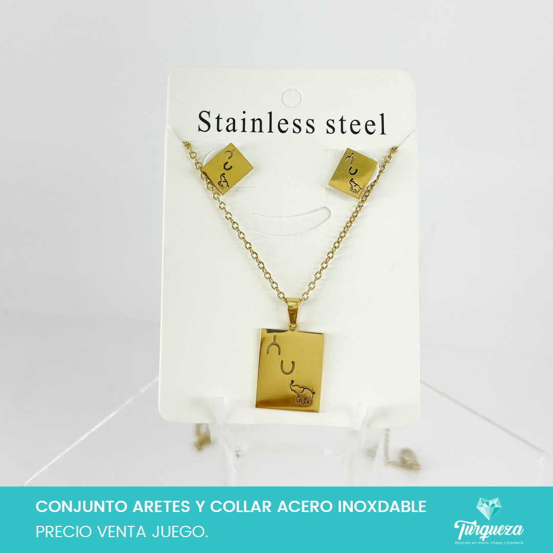 Conjunto Amuleto de la Suerte Rectangular Dorado Acero Inoxidable